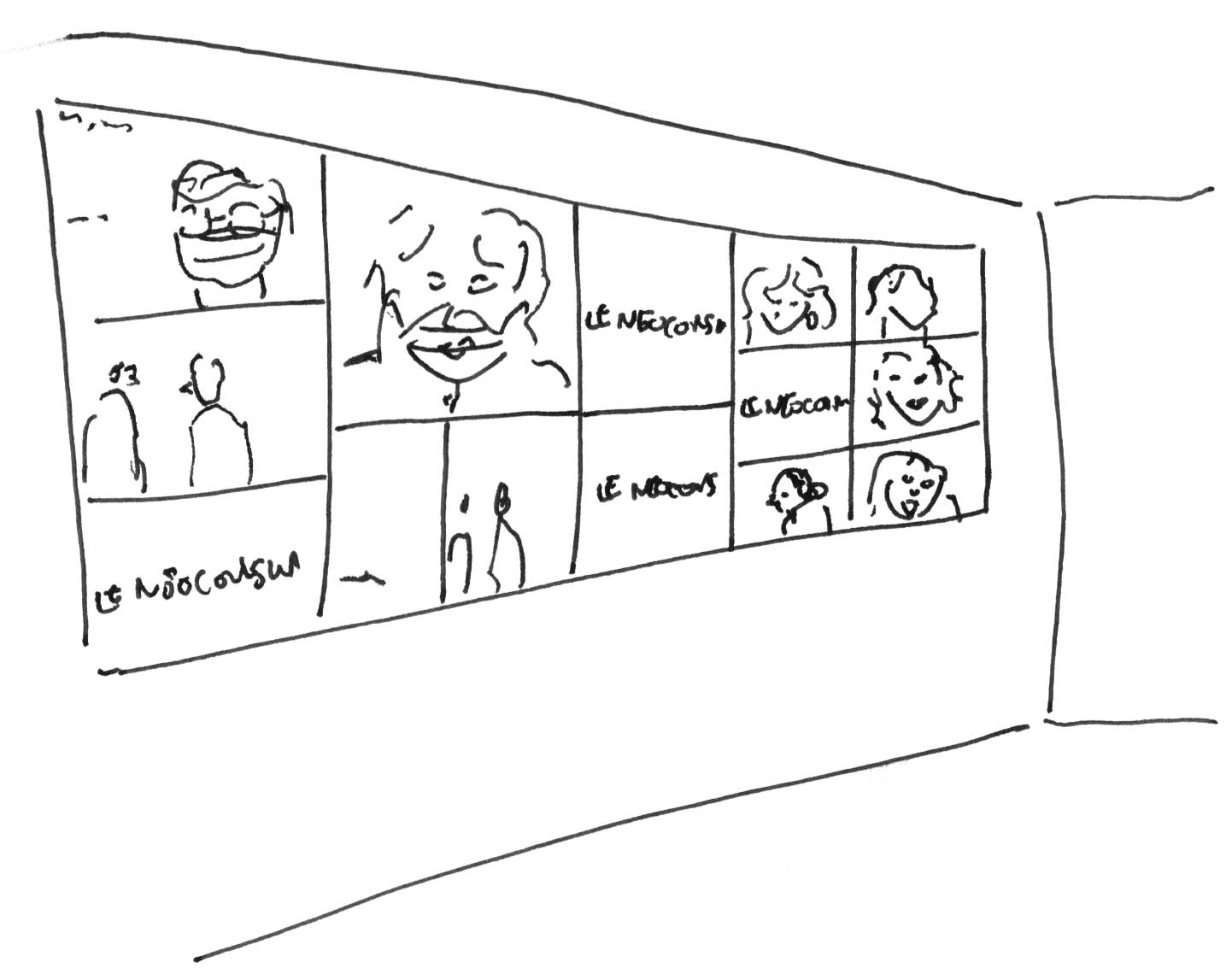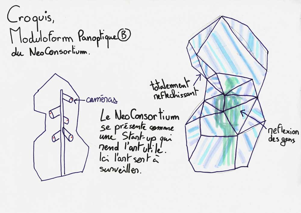 Vous êtes filmés ! Le NeoConsortium est une entreprise multinationale leader mondial sur le marché de l’art contemporain. Le Moduloform est devenu le produit phare du NeoConsortium. Celui-ci est se retrouve à l’exposition « Au-delà du réel ? » de la Biennale Némo, au 104. Il se présente en deux parties. Dans la première partie, l’œuvre d’art se présente avec différentes facettes recouvertes de miroirs qui agissent comme un kaléidoscope. Des phrases accrocheuses comme des slogans sont inscrites sur les murs de la pièce. Derrière l’un des murs de la salle le visiteur est accueilli par la projection de vidéos. Il est pris au dépourvu en comprenant alors que la sculpture précédente présentait des caméras cachées derrière les miroirs. Les caméras surveillent à 360 degrés et les vidéos sont retransmises ici. Ce dispositif immersif, qui capte en permanence son environnement, invite alors à la réflexion des visiteurs.
