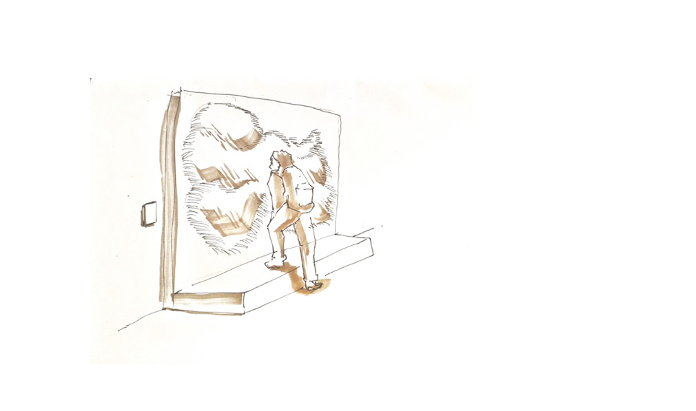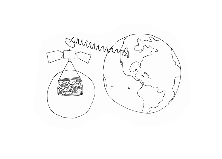 Phrase d'accroche du texte en anglais This artwork is about the planet Mars. It is composed of a device that mechanically draws a restitution of the landscapes of Mars thanks to data sent by the Mars Reconnaissance Orbiter (MRO) satellite. The machine draws these landscapes very precisely under our eyes. A large fresco shows several finished drawings, and there are also screens that explain the process of the data collect up to the drawings. In fact, the MRO satellite orbits around Mars and thanks to a telescope aimed at the surface of the planet, it captures its surface in high resolution. The data is then transmitted at the speed of light from the satellite to the Earth using radio waves. On Earth, these waves are received thanks to a network of satellite antennas, then scientists overlay 2 images from the data to make a digital image of the topography. This image is then transformed into a 3D model and processed by an algorithm that generates a line drawing. The machine received this file to make the drawing. The artist, by making all these informations visibile, wants to show us Mars, that is invisible to our eyes but that we know about. Rather than showing an interpretation of what the planet might look like, he has chosen to represent it factually and mathematically using NASA's data. It also shows us other phenomena that are invisible to our eyes, such as satellites, the process of data transmission and radio waves.