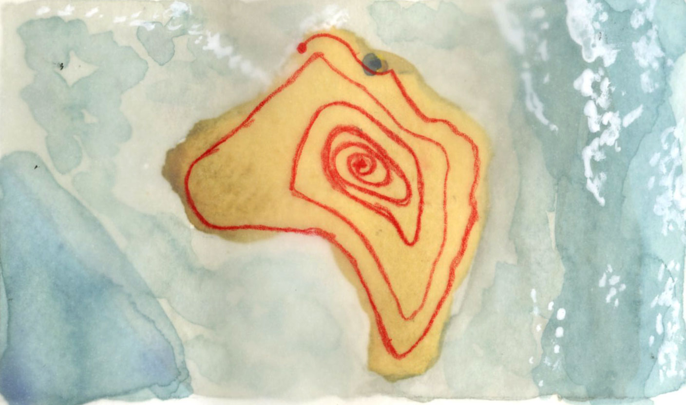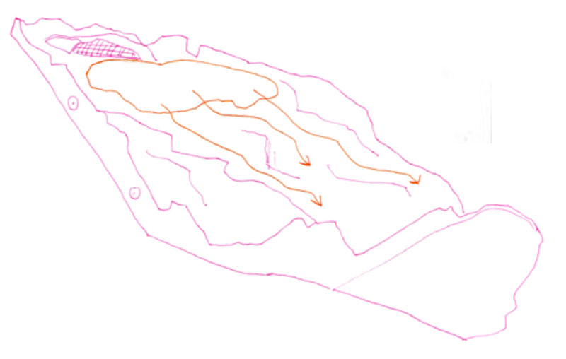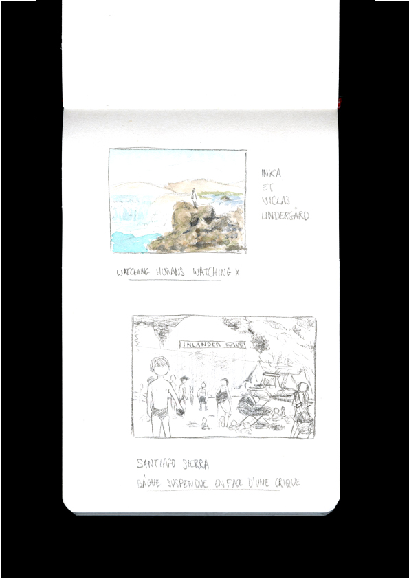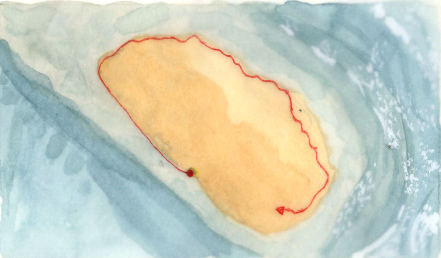 Le voyage est une quête sans fin ... Cette vidéo fait partie d’une trilogie qui s’étale sur une durée de plus de vingt ans. Celle-ci a été filmé en drone, on voit une personne longeant les côtes d’une bande de sable qui se rétrécit au fur et à mesure son déplacement. L’artiste met en place un personnage dans une quête sisyphéenne dont même les vagues qui l’entourent ne l’arrête pas. Les traces de son voyage disparaissent comme si celui n’avait jamais existé. On peut l’interpréter sous le prisme du changement climatique. Les îles se retrouvent avec une problématique la montée des eaux à cause de la fonte des glaces. Il ne sera pas rare que certaines dans quelques années disparaissent sous les eaux sans que l’homme n’ait pu changer quelque chose. Le titre évoque aussi un voyage sans destination.