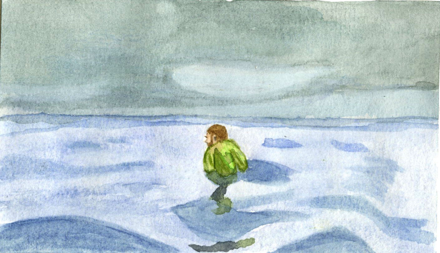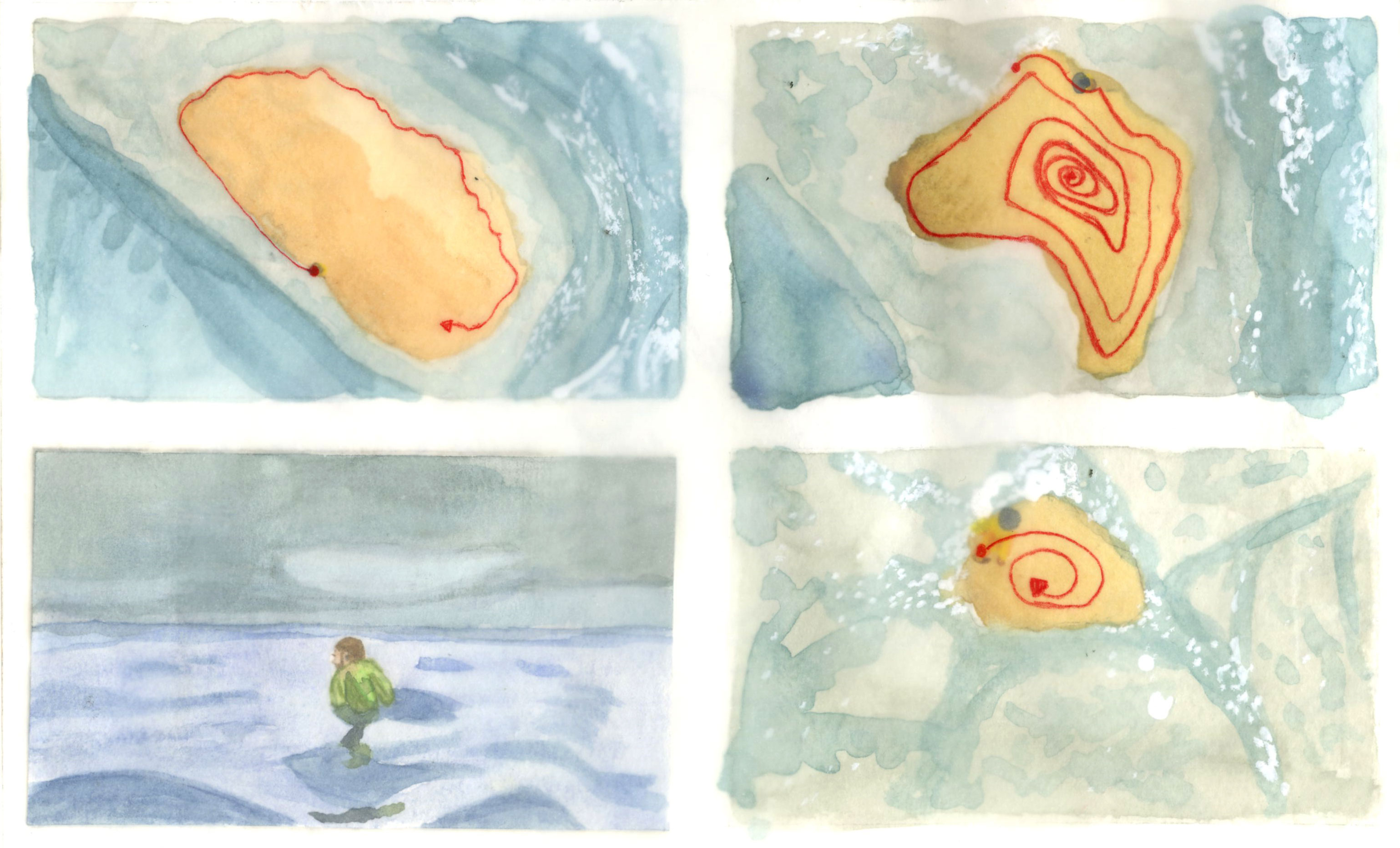 The journey is an endless quest ...This video is part of a trilogy that spans over twenty years. This one was filmed by drone, we see a person going along the coast of a strip of sand that narrows as he moves. The artist puts in place a character in a Sisyphean quest that even the waves that surround him do not stop him. The traces of his journey disappear as if it had never existed. It can be interpreted under the prism of climate change. The islands find themselves with a problem; the rise of the waters because of the melting of the ice. It will not be uncommon for some of them to disappear under the water in a few years without man having been able to change anything. The title also evokes a journey without destination.