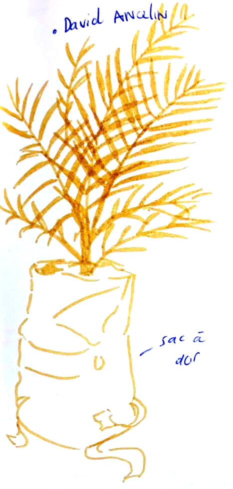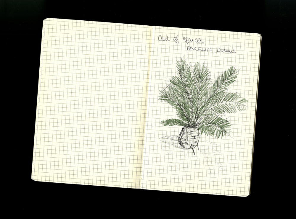 L'absurdité du palmier immobile Fièrement planté dans un sac à dos de randonneur, un palmier surplombe la pièce. Il s'agit de l'œuvre de David Ancelin, Out of Africa, jouant sur le contraste entre l'exotisme et la quotidienneté. Le palmier, élément naturel, domine ici le sac à dos, symbole du voyage, et le force à l'immobilité. L'artiste dénonce tous ceux qui perturbent la nature en en déracinant un bout pour le ramener chez eux, en permettant à cette nature de prendre sa revanche avec humour. De plus, il questionne la place de cet arbre qui a perdu son paysage. Garde-t-il un sens, par exemple comme support de la mémoire, où n'est-il qu'accessoire ?