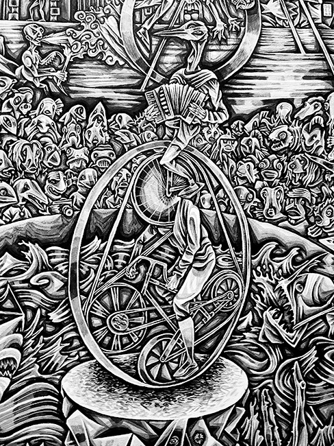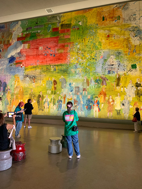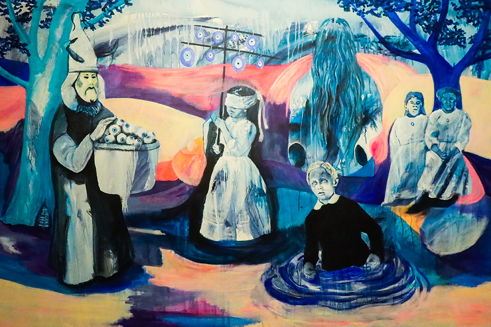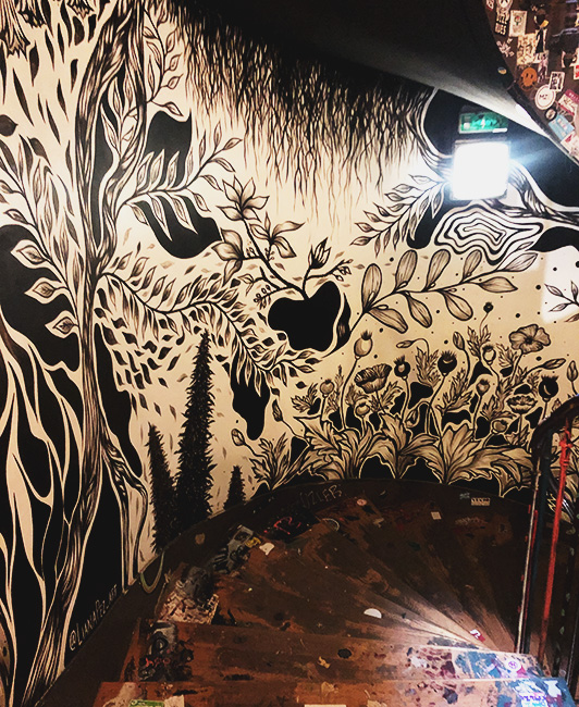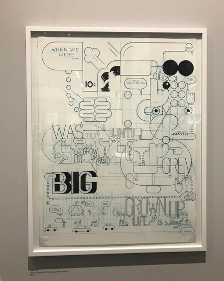 Surprise ! Situé à côté du Sacré-Cœur et entouré par ses nombreux touristes, ses bancs, ses arbres puis ses petites boutiques de tissus, le cadre de la Halle Saint-Pierre est agréable et suscite la curiosité de toutes personnes voulant s’y aventurer. La Halle Saint-Pierre qui abritait auparavant un marché puis une école, abrite maintenant une galerie, une librairie, un auditorium et un café. En entrant dans la Halle, il y avait une ambiance calme, le personnel d’accueil était sympa et le bâtiment était ancien. Nous y sommes allés pour visiter l’exposition «Hey ! Le dessin ». Une fois passé le rideau, « surprise » ! C’est le premier mot qui me vient en tête. C’était extrêmement diversifié, étrange, intéressant, et parfois (même très souvent) dérangeant. Entre les démons, les personnages nus, les tableaux au style « manga », les tags et les mosaïques colorées, la surprise était à son comble. Il y avait dans cette galerie une grande diversité d’artistes et d’œuvres. À chaque nouvel espace, je découvrais des nouveaux univers, des nouveaux styles et ressentais des émotions totalement différentes.