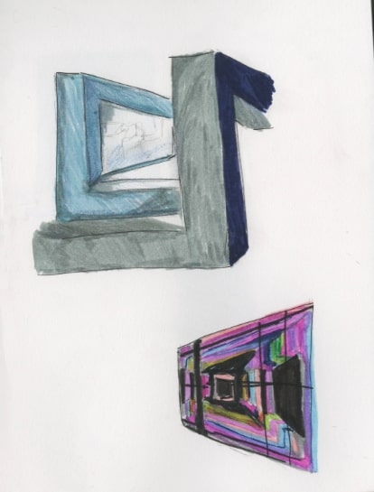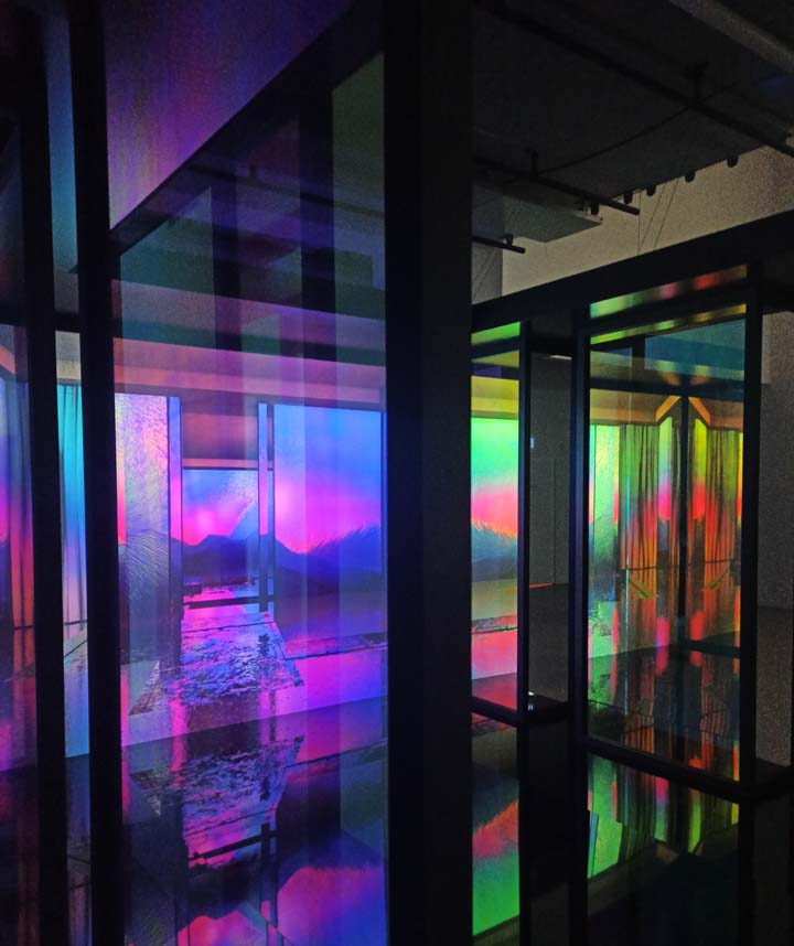 You are filmed !The NeoConsortium is a world-leading multinational company in the contemporary art market. The Moduloform has become the flagship product of the NeoConsortium. This one is found at the exhibition "Beyond reality?" of the Biennale Némo, at 104. It is presented in two parts. In the first part, the artwork presents itself with different facets covered with mirrors that act as a kaleidoscope. Catchy phrases like slogans are written on the walls of the room. Behind one of the walls of the room the visitor is welcomed by the projection of videos. He is caught off guard when he realizes that the previous sculpture featured hidden cameras behind mirrors. The cameras monitor 360 degrees and the videos are transmitted here. This immersive device, which permanently captures its environment, invites visitors to reflect.
