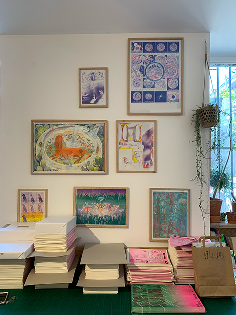 Hide at the bottom of the street d'Eupatoria, the publishing house of Quintal, welcomes usI discovered a small workshop with a wooden case, filled with a lot of color and plants. thanks to the exchange with the owner Oscar Ginter, he explains to me how works on the principal of printing with the technique of Risographie who is of Japonese descent, it has for goal to superpose some cold colors with the help of transfer rollers, and this creates the effect of the gap or even a unique print grain. I could discover a lot of pieces of art, photography, illustrations or again printed works. This publishing house, transfer us in another colorful universe.