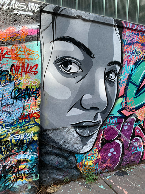 Entre déception et surprise pour le mur de Rosa Parks Le Mur de Rosa Parks présent dans la rue d'Aubervilliers, est un mur de 400 mètres qui sépare le XVIIIe et le XIXe. Cet édifice est recouvert d'œuvres "street art" ou "art de rue". Malgré l'absence de nombreuses œuvres présentes sur internet qui ont été recouverts par de nouveaux dessins, on a pu découvrir des œuvres murales sur les immeubles à proximité, ou encore le 104 de Paris, qui est un espace de résidence, d'ateliers et d'expositions.