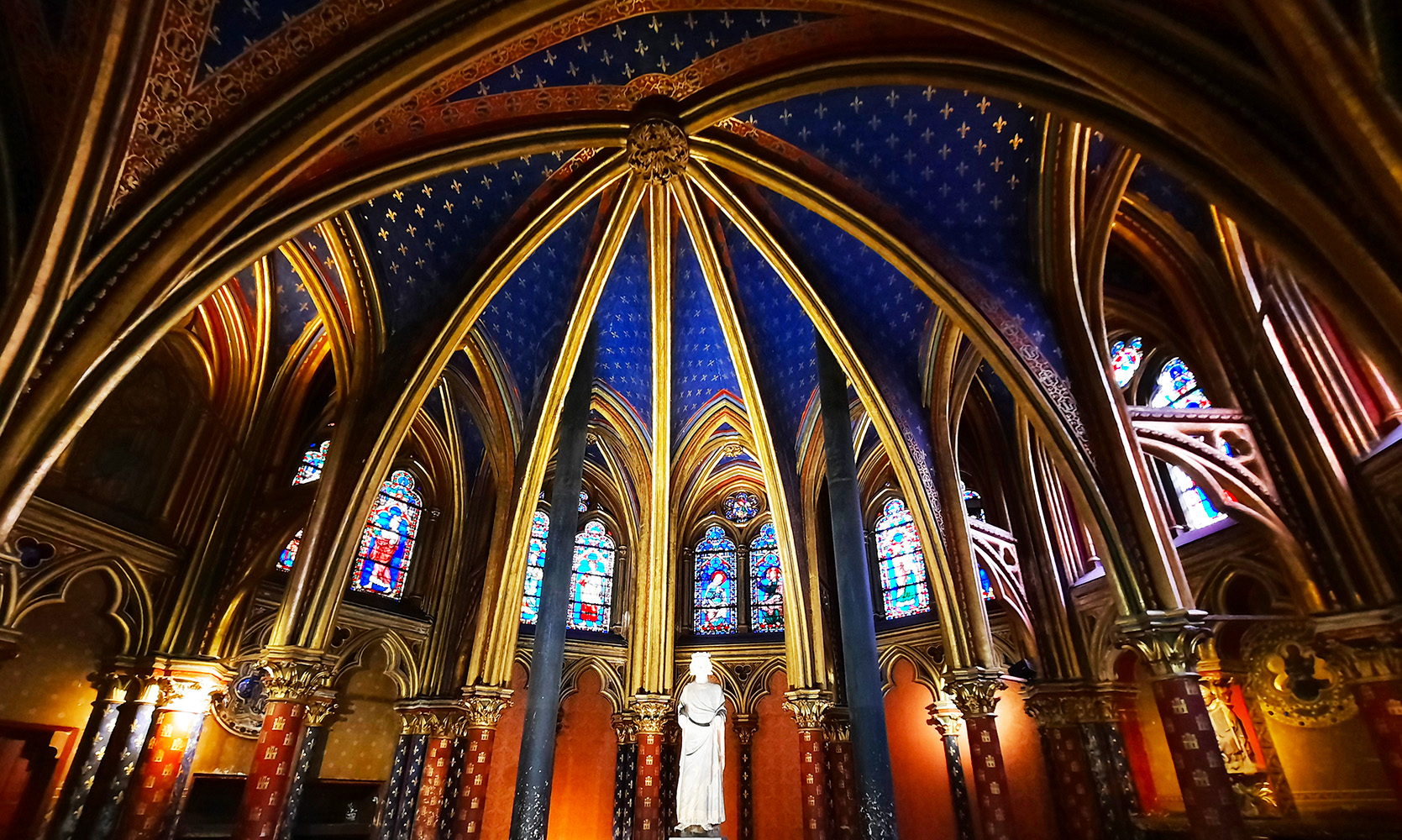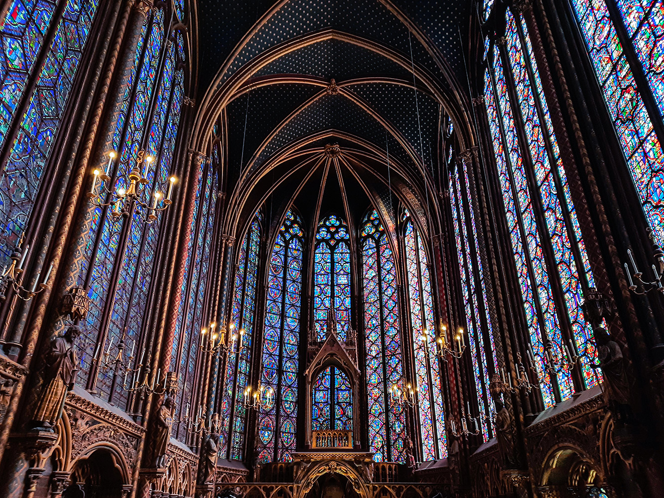 The monumental wonder of the Sainte ChapelleI went to the holy chapel located on the Ile de la Cité. It belongs to the 1st and 4th arrondissements of Paris. It was built between 1241 and 1248. It is surrounded by two arms of the Seine, the large northern arm and the small southern arm. It was built at the request of Louis IV, known as Saint Louis, to house the Holy Crown of Thorns, a piece of the True Cross, as well as various other relics acquired from 1239. I really enjoyed this place because of its pointed arch vaults, as well as the radiance of the light sublimating the paintings (mainly of a blue base, with a few touches of red and yellow), all spread over 15 windows and 15 metres high. The spirit of this gothic church can be felt perfectly. The monumental effect that I felt was accentuated by the very high ceiling but also by the numerous details and gilding in the form of fleurs de lys, arabesques... We are small in front of this immense sacred place.